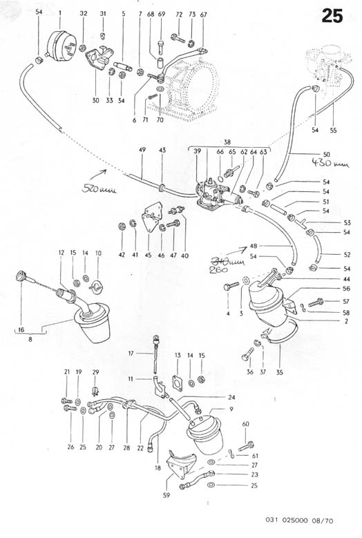 01 - Engine, complete / Engine, short 02 - Crankcase, Mounting Parts for Engine & Transmission 03 - Cylinder, Cylinder Head 04 - Crankshaft, Connecting Rod, Bearings 05 - Piston, Piston Ring 06 - Camshaft, Valves 07 - Oil Pump, Dual Oil Pump, Oil Strainer 08 - Oil Filler Pipe, Oil Dipstick 09 - Oil Cooler 10 - Housing- Fan, Fan 11 - Cooling Air Controlls 12 - Engine Cover Plates 13 - Fuel Pump 14 - Fuel Line 16 - Carburetor, Carburetor Body, upper part 17-20 - Caburetor Body, lower part 18 - Air Cleaner 19 - Air Cleaner with Connecting Parts 19-10 - Air Cleaner with Connecting Parts, L-Jetronic 20 - Intake Manifold 21 - Exhaust Emission Control System 21-10 Exhaust Recirculation for L-Jetronic 21-20 Deceleration Boost, Exhaust Recirculation for L-Jetronic 21-30 Intake System, Altitude Correction Parts for L-Jetronic 21-40 Fuel Line for L-Jetronic 21-50 Electronic Control Unit, Fuel Pump, Series Resistance for L-Jetronic 22 - Clutch 23 - Release Bearing, Operating Shaft, Clutch Operating Lever 25 - Servo for Automatic StickShift
